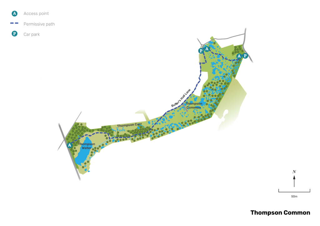 A permissive path can be found that goes across the common. This path is one that is a section of the wider Pingo Trail across the region.